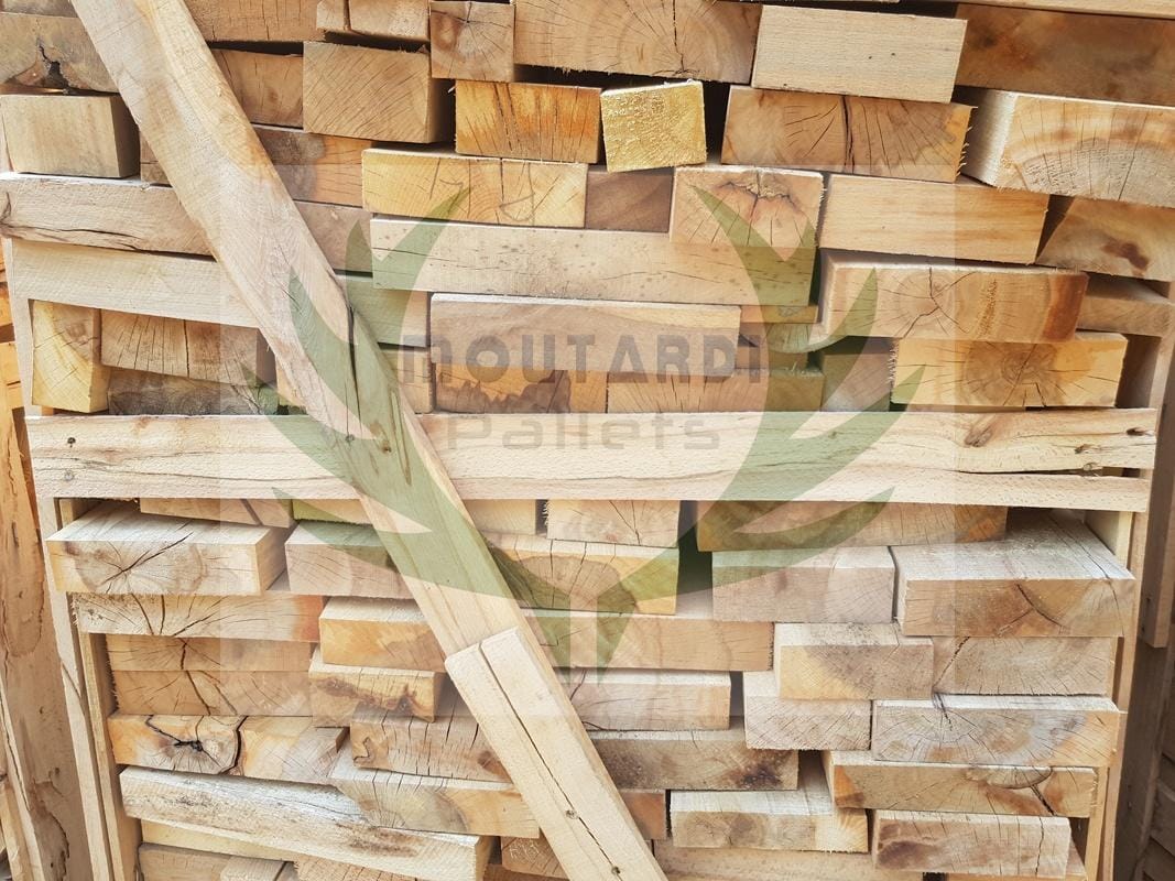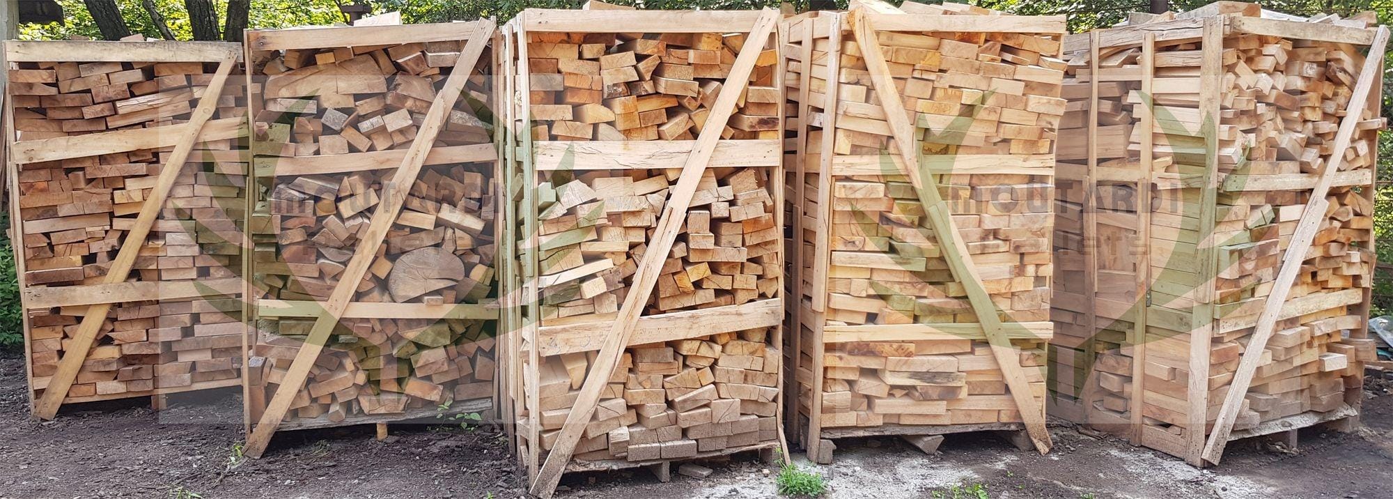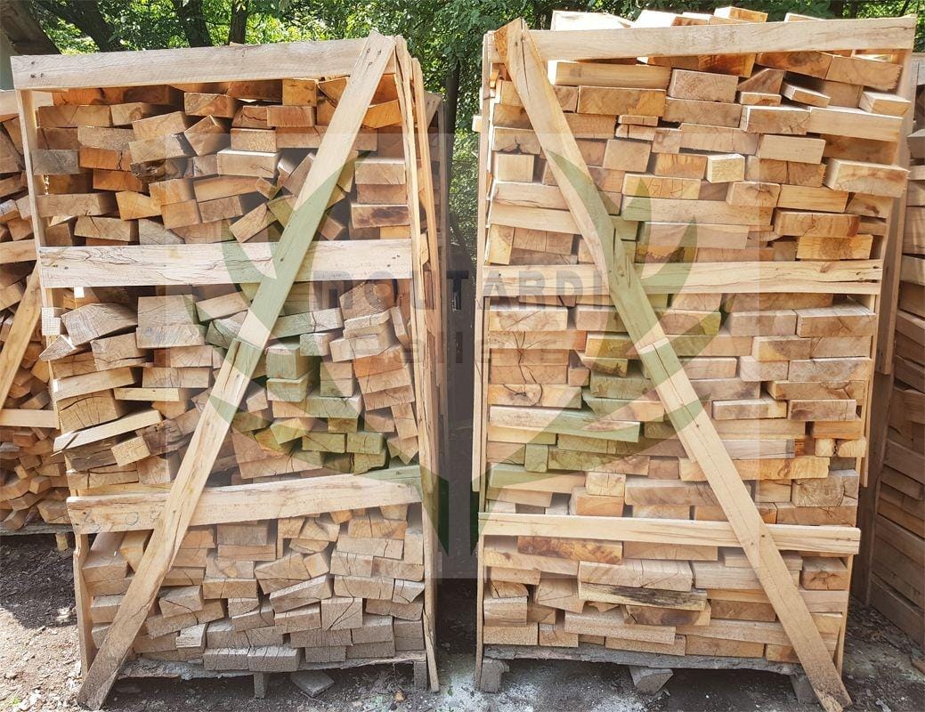 Modul de ambalare, ca si in cazul lemnului de foc despicat este in paleti standart 1x1x1.8 m. numai ca in cazul acestui tip de lemn de foc, paletii nu mai au 1 mc. ci 1.3-1.4 mc. intrucat fiind din cherestea, colturile lemnului sunt la 90° iar aranjarea in palet se face cu mult mai putine goluri de aer fata de lemnul de foc despicat.